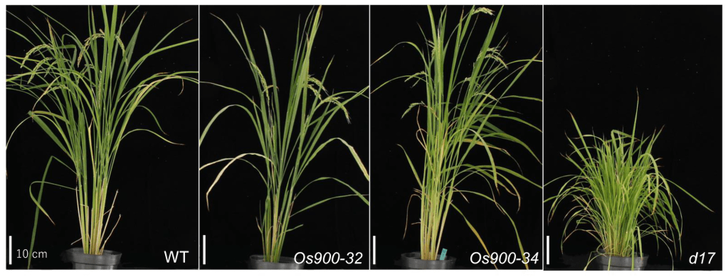 Figure 1D from Shinsaku et al, Science Advances, 2002. CC BY 4.0. Shoot phenotypes of wild type (WT), canonical SL mutants (Os900 lines), and a mutant representing typical developmental issues when disrupting SL biosynthesis  (d17 mutant) grown in soil.